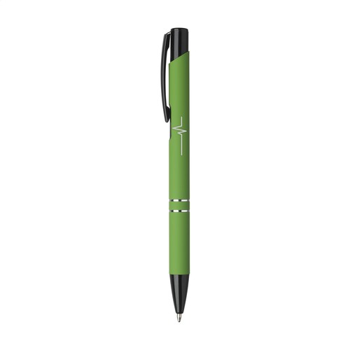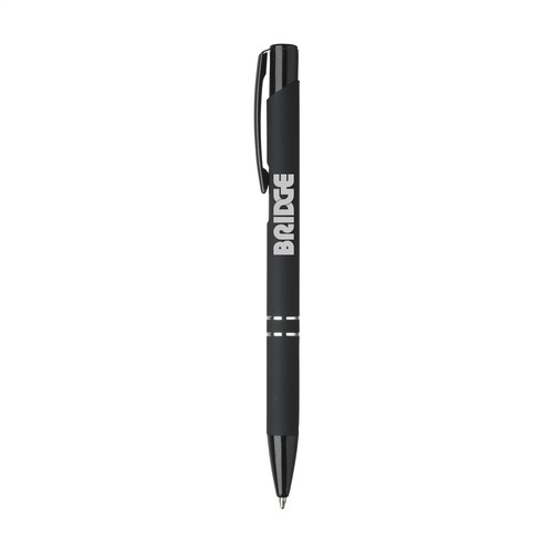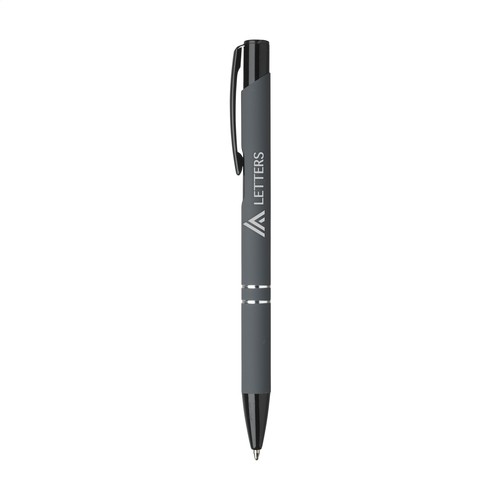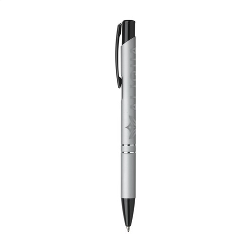 Blauschreibender Kugelschreiber mit schwarzem Druckknopf/Clip und Spitze, Chromverflechtungen. Das Gehäuse ist von einer Gummierung abgeschlossen. Materialien: Gummi