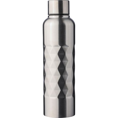Es handelt sich um eine einwandige Trinkflasche aus recyceltem Edelstahl (800 ml) mit rautenförmiger Textur auf dem Körper, Schraubdeckel und einem lasergravierten Recycling-Logo. Sie wurde aus Edelstahl 304 hergestellt. Sie ist einzeln verpackt in einer braunen Pappschachtel. Colors : Schwarz Materials : Recycelter Edelstahl.