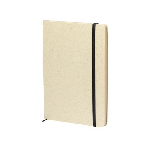 A5 Notizblock mit festem Einband aus recyceltem Gras. 80 linierte Seiten mit kraftvoller Oberfläche, mit Lesezeichen und Gummiband in Schwarz. Graspapier-Logo auf Vorder- und Rückseite und in einer individuellen Tasche.Graspapier ist eine perfekte Alternative, die Nachhaltigkeit während des Herstellungsprozesses garantiert und die Umweltauswirkungen aufgrund des schnellen Wachstums und des geringen Bedarfs an Ressourcen für den Anbau reduziert. Darüber hinaus werden 50 % Papier auf Grasbasis mit anderen umweltfreundlichen Elementen wie recyceltem Holz kombiniert. Hardcover-Abdeckung. 80 Blätter Composition : Graspapier.