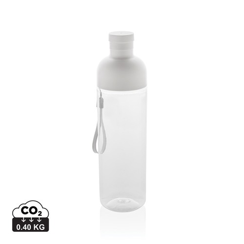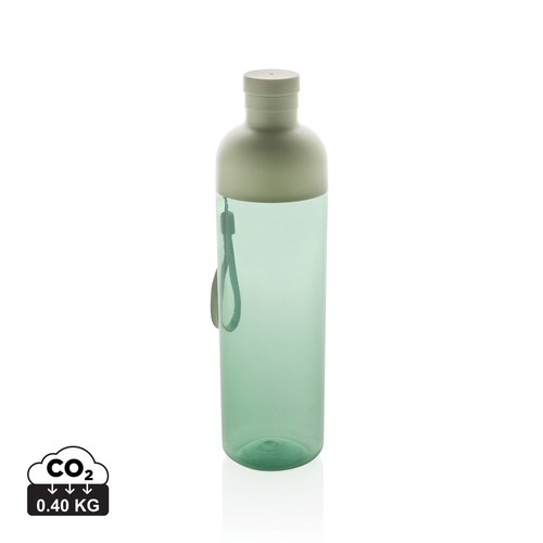 Mit ihrem frischen Design ist die Flasche nicht nur einfach zu benutzen, sondern auch schön anzusehen. Der geteilte Körper ist leicht zu reinigen und eignet sich hervorragend, wenn Sie Eiswürfel in Ihre Flasche geben möchten. Am Flaschenkörper ist ein Riemen zum einfachen Tragen angebracht. 2% des Erlöses jedes verkauften Produkts der Impact Collection werden an Water.org gespendet. Nur von Hand waschen. Dieses Produkt ist nur für kalte Getränke geeignet. Gesamter recycelter Inhalt: 96%, bezogen auf das Gesamtgewicht des Artikels. BPA-frei. Fassungsvermögen 600ml. Einschließlich FSC®-zertifizierter Kraft-Geschenkverpackung. Material : PET – recycelt, Polypropylen – recycelt Recycled Content Percent : 96 Gebrauch von Bisphenol A-freien Materialien, Konformität der Lebensmittelsicherheitsrichtlinie 1935/2004/EC & 2020/1245, Konformität mit der deutschen Lebensmittelsicherheitsgesetzgebung ( LFBG), Zertifikat des Recycled Claim Standard Packaging : Papiertüte & Geschenkbox All print codes : Pad Print Drinkware,Doming,Digital round 360-2,SilkScreen Round – Print code default : Tampondruck – Artikel Vorderseite oben – 25 x 10 mm – max color : 5 Social Audits : BSCI Total CO2 emissions : 0,4.