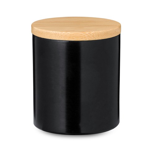 Vanille-Duftkerze. Präsentiert in einem Metallgefäß mit Bambusdeckel. Glas in vielen Farben erhältlich, mit Metalloberfläche. Einzeln präsentiert in einer Kraft-Design-Box. Materialien wie Bambus fördern die Verwendung natürlicher Rohstoffe und reduzieren den Schadstoffausstoß. Darüber hinaus stammt Bambus aus einer äußerst widerstandsfähigen und vielseitigen Pflanze mit schnellem Wachstum und Regeneration, was ihn zu einer hervorragenden Alternative zur Verwendung von herkömmlichem Holz macht. Vanille Aroma Composition : Aluminium/ Bambus.