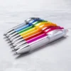 Kugelschreiber mit Push-up-Mechanismus in auffälligem, zweifarbigem Design. Gehäuse in weißer Farbe und Clip in verschieden breiten Farben. Großer Druckbereich und blaue Tintenmine.