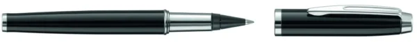 Metall-Patronen-Roller mit Metallzierring. Beschlagteile glanzverchromt. Das Patronen-Roller-System arbeitet nach dem Prinzip des Füllhalters und kann mit Standard-Tintenpatronen nachgefüllt werden.
