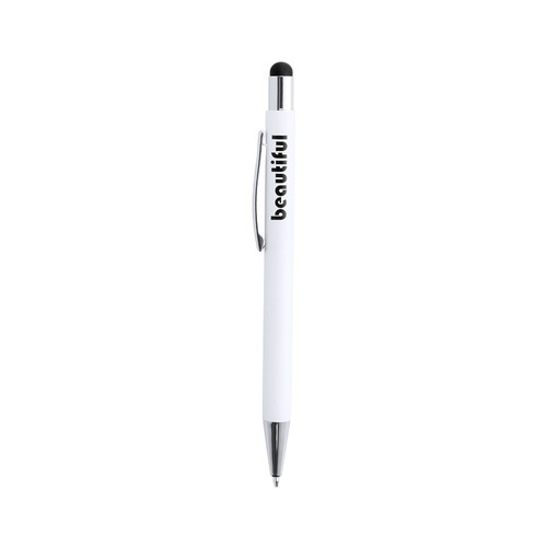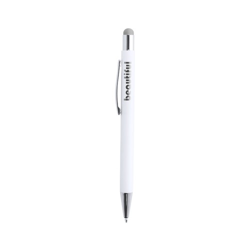 Druck-Kugelschreiber mit Stylus aus Aluminium in einem eleganten, matten Weiß. Mit Stylus in einer Vielzahl von Farben – farblich passend zum Interieur – und verchromten Kontrastdetails. Mit Außenbeschichtung, die speziell für die Lasermarkierung entwickelt wurde, so dass Ihr Logo in der Farbe des Interieurs graviert wird. Jumbo-Patrone mit blauer Tinte. Jumbo Mine Composition : Aluminium.