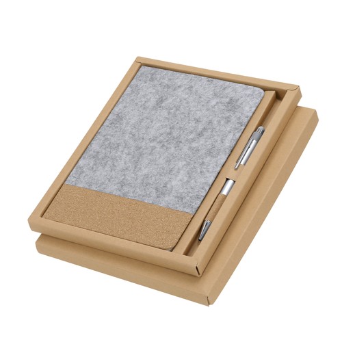 Notizblock- und Kugelschreiber-Set aus RPET-Filz und recyceltem Aluminium. Enthält einen Notizblock mit festem Einband aus RPET-Filz und Naturkork mit 80 linierten Blättern, Gummibandverschluss, Lesezeichen und einem braunen Kugelschreiberhalter. Darüber hinaus ist ein Kugelschreiber aus recyceltem Aluminium mit Griffstück aus Naturkork, Druckknopfmechanismus und blauer Tinte enthalten. Elegant präsentiert in einer Geschenkbox. RPET-Filz ist das Ergebnis der Kombination der Recyclingprozesse von Kunststoffmaterialien mit der tausendjährigen Technik der Filzherstellung. Das Ergebnis ist ein Öko-Trendmaterial, das nicht nur recycelten Ursprungs ist, sondern auch recycelbar ist. Notizblock Hardcover-Abdeckung. 80 Blätter. Kugelschreiber Reclycling Aluminium/ Kork. Jumbo Mine Composition : Filz RPET/ Kork.