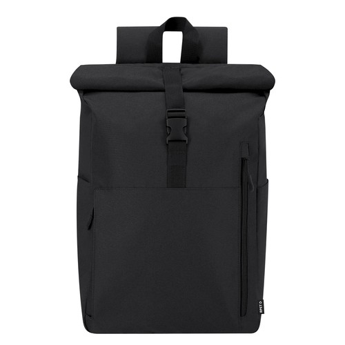 Rucksack aus strapazierfähigem 300D RPET mit Rollverschluss und Schnalle. Mit zwei Fronttaschen, einer Rücktasche mit seitlichem Zugang und zwei zusätzlichen Seitentaschen. Geräumiges Innenfach mit gepolstertem Fach für Laptops bis 15 Zoll. Gepolsterte Schultergurte und Rückenpartie. Mit Gepäckband zur Befestigung am Trolley oder Koffer – ideal für Reisen und Pendeln. RPET-Material wird aus recyceltem Kunststoff hergestellt, um die Wiederverwendung von Plastikabfällen zu fördern und zur Nachhaltigkeit des Planeten beizutragen. Gepolsterte Laptoptasche. Gepolsterter Rücken und Schultergurte Composition : Polyester 300D RPET.