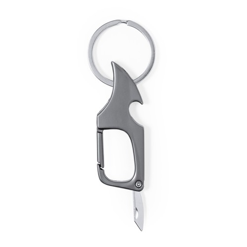 Praktischer Metallöffner mit Schlüsselring und Karabiner zur schnellen Befestigung. Mit Flaschenöffner an einem Ende und einem kleinen Edelstahlmesser am anderen Ende, ideal zum Öffnen von Briefen, Paketen … In einer eleganten metallischen schwarzen Farbe und präsentiert in einer recycelten Papiertüte. Composition : Metall.